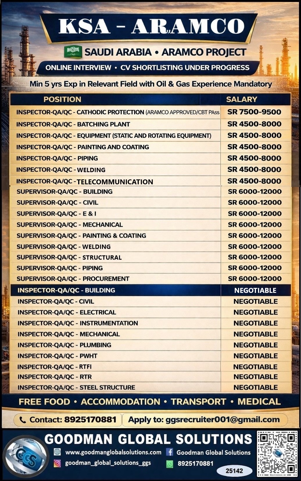 SAUDI ARABIA -ARAMCO PROJECT- LONG TERM ONLINE INTERVIEW - CV SHORTLISTING IN CHENNAI