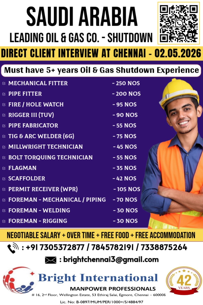 • SAUDI ARABIA -ARAMCO PROJECT- LONG TERM ONLINE INTERVIEW - CV SHORTLISTING IN CHENNAI