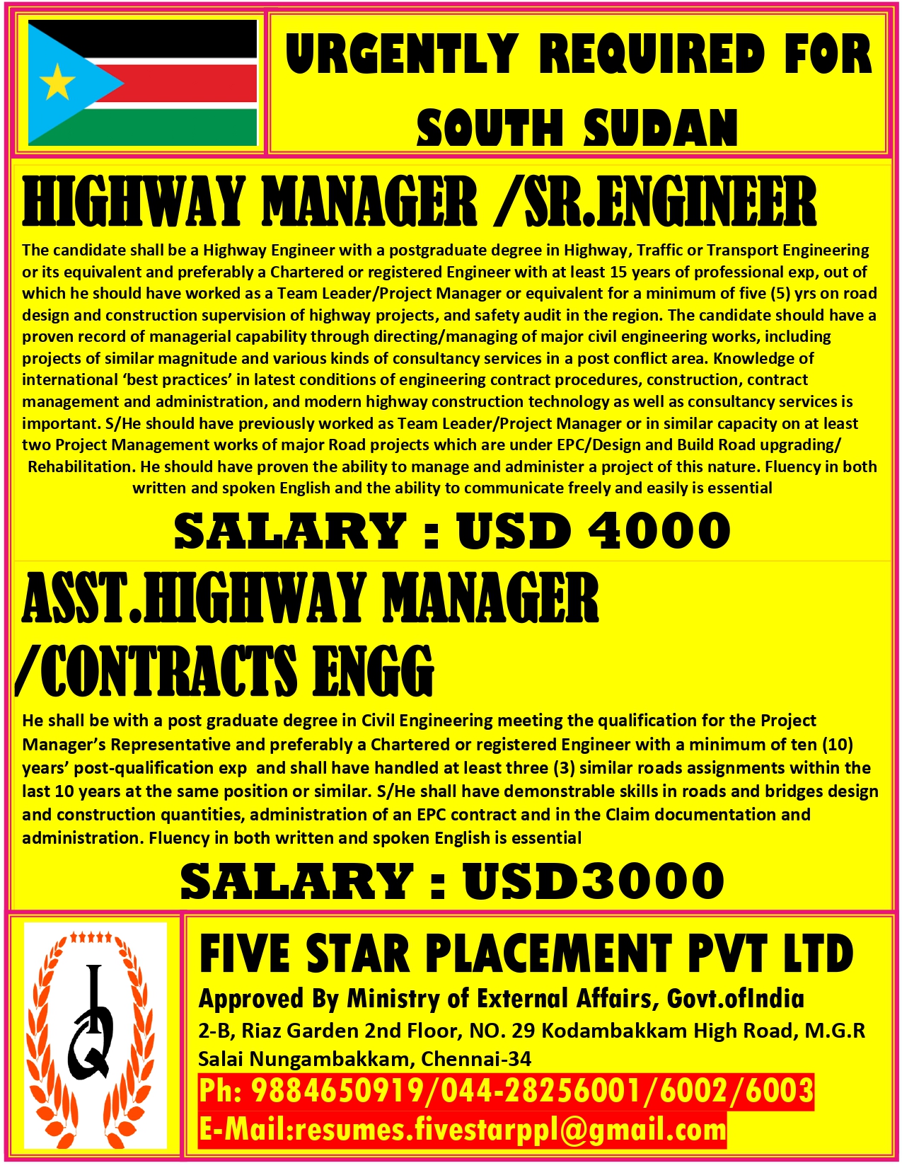 - URGENT REQUIREMENT FOR SAUDI ARABIA Interested candida tes can share your cv along with all credentials below Mail Id EMAIL:resumes.fivestarplacement@gmail.com CONTACT NO : 9884650919/044-28256001/28256002/28256003