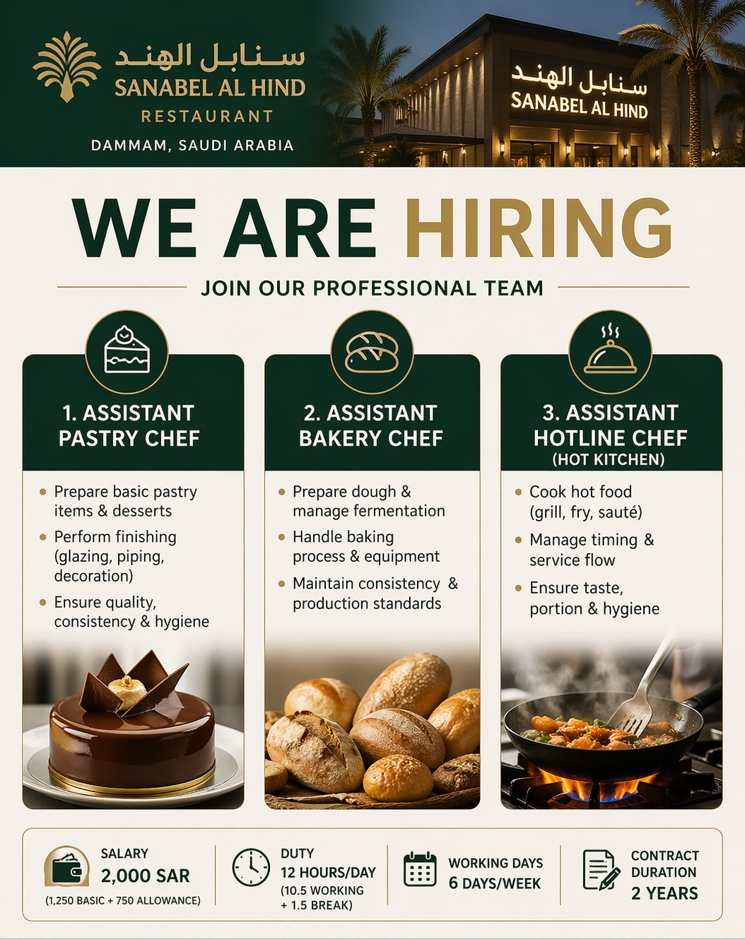 π¨ Urgent Hiring for Saudi Arabia πΈπ¦ A Reputed Royal Family (Al Nafea Foods) π¨βπ³ Senior House Cook β 2200 SAR π¨βπ³ Junior House Cook β 1800 SAR π House Driver β...